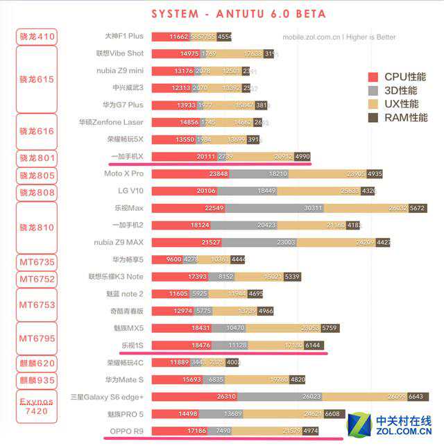 至于跑分来看,MT6755还是相较于上一代MT6752有着一定提升,主要体现在UX性能方面;与联发科的高端系列HelioX10相比差距并不大,显著超越骁龙615、616等平台。